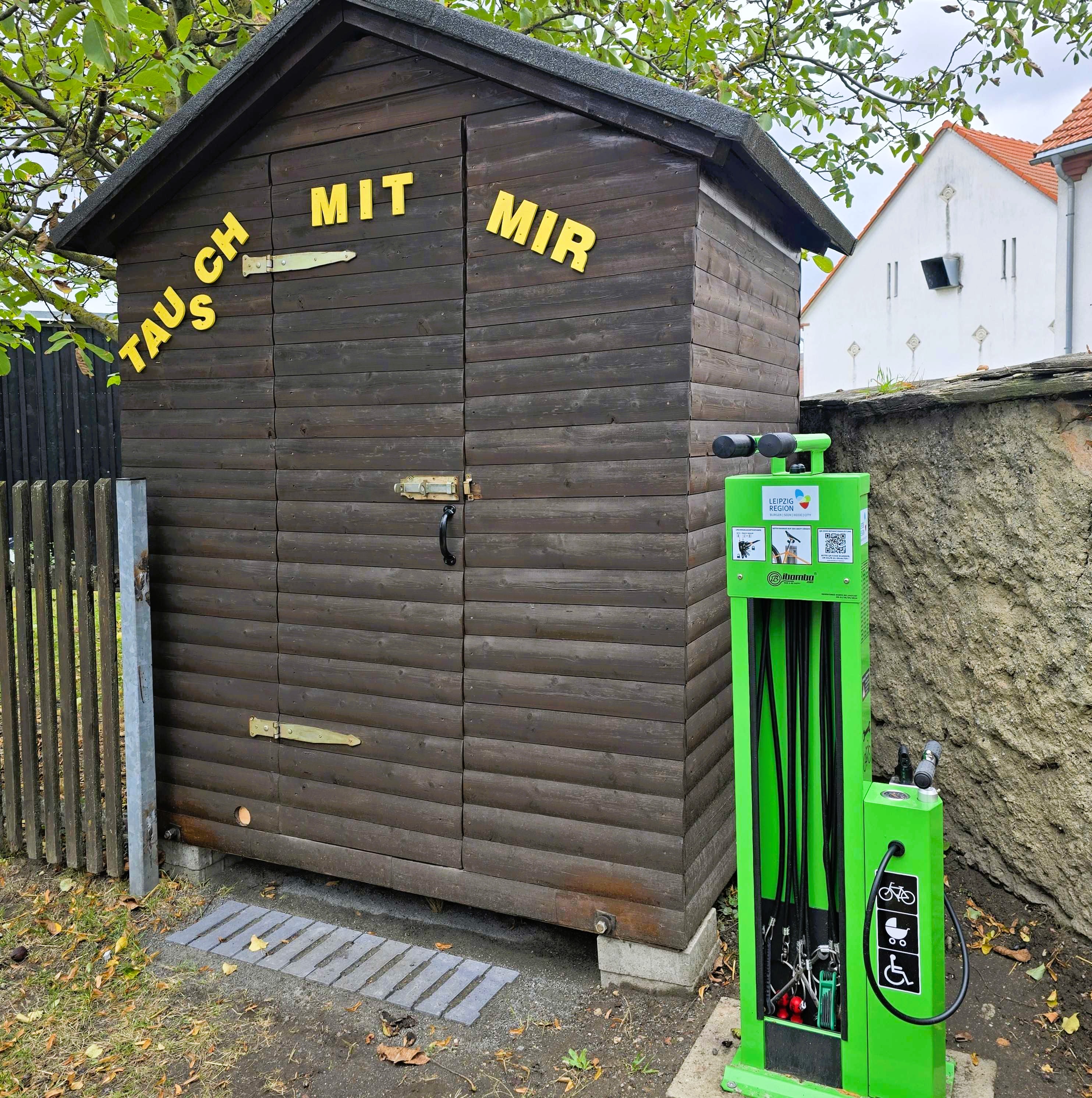 PS: Neu ist auch die freundlich-grüne Säule neben der Bücherbude: Eine Servicestation mit dem nötigsten Werkzeug für Reparaturen bei Pannen an Fahrrädern & Co.